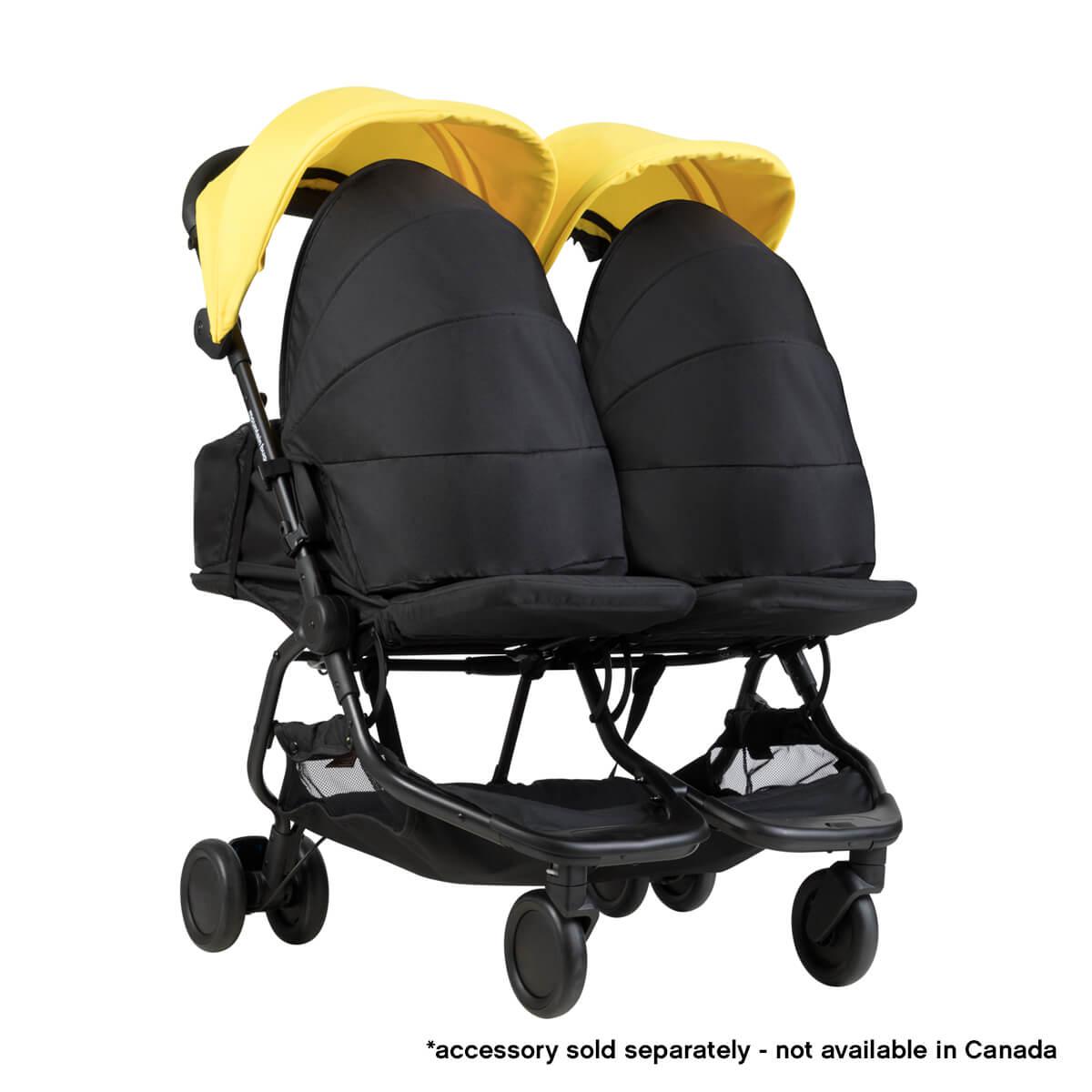 Коляска для двійнят і погодок Mountain Buggy Nano Duo (Маунтин Багі Нано Дуо) обладнана двома роздільними капюшонами з козирками, що висуваються, для захисту від сонця або вітру. Як і Маунтін Багі Нано, коляска для двох дітей має регульовані підніжки. Кошик для покупок та іграшок у колясці один. До неї є прекрасний доступ спереду та ззаду коляски.
